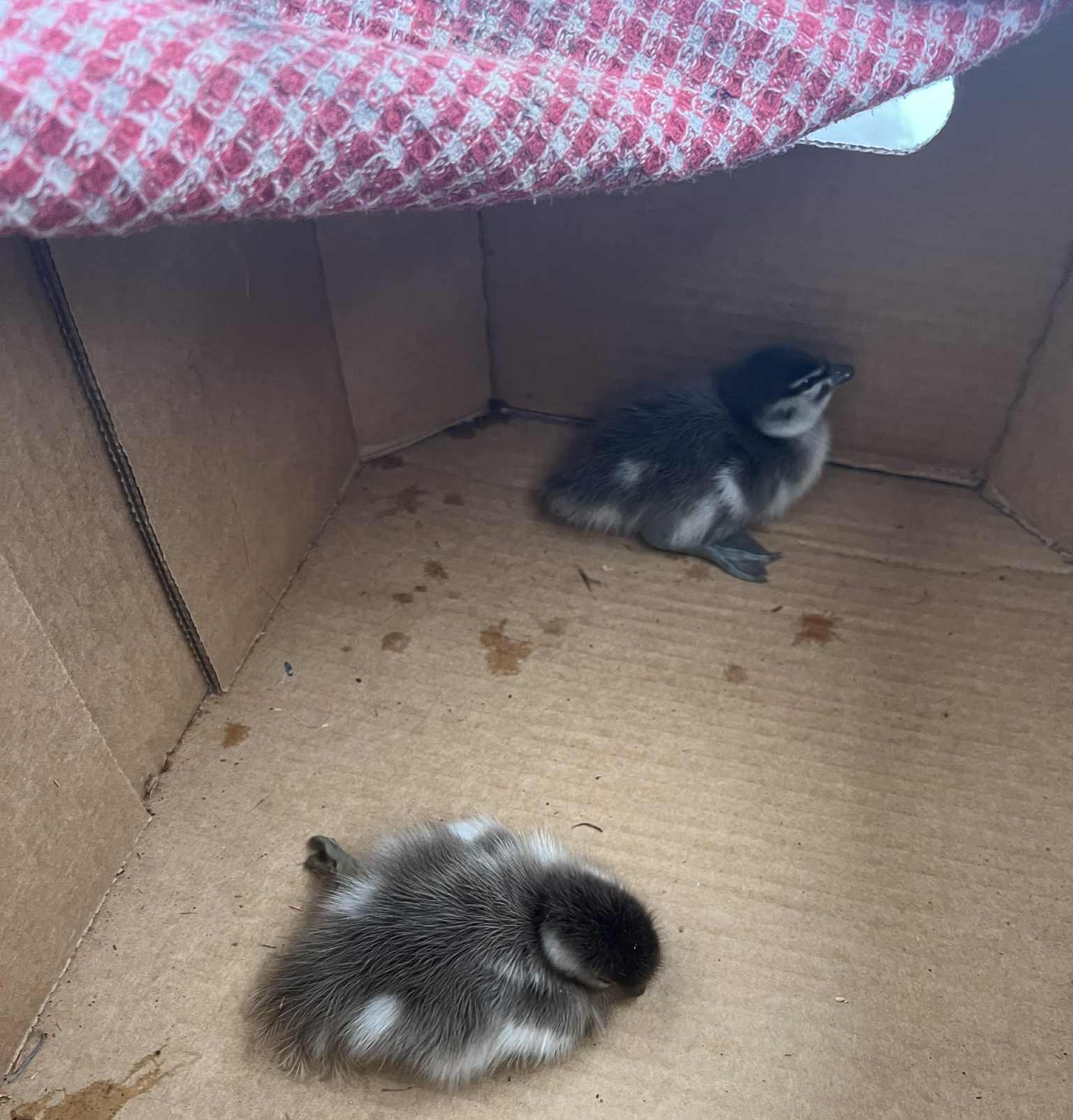 He quickly gathered the ducklings into a box, placing a towel over the top to keep them calm.