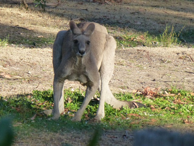 As I happened to glance over the solid fence that separates the garden from the side paddock, I noticed a kangaroo standing there. Something about her caught my attention. She seemed to be⊠straining.